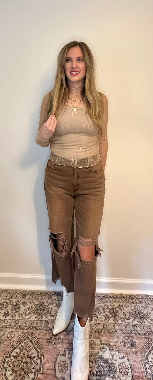 Sheer Lace Mock Neck Long Sleeve Layering Top