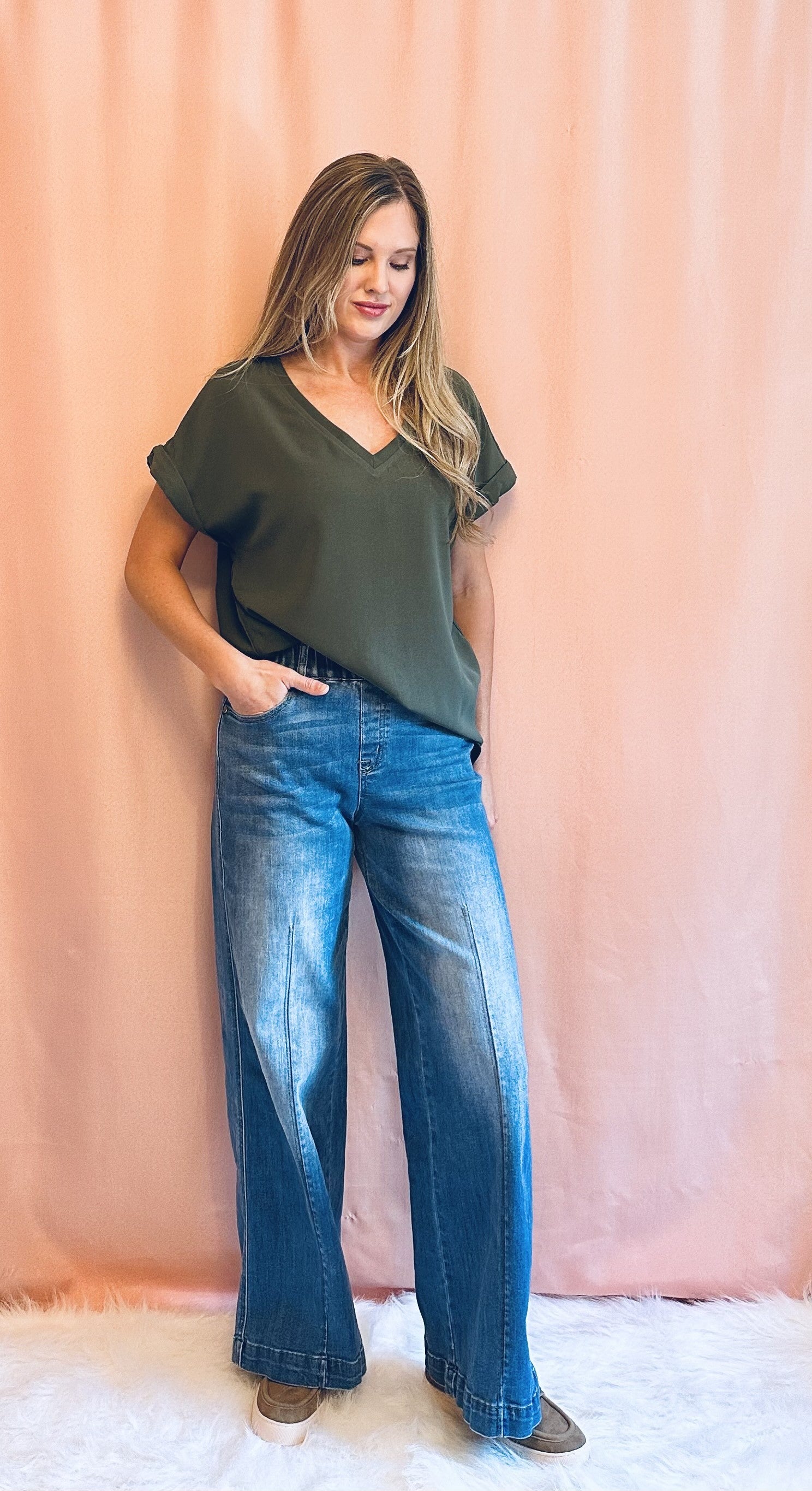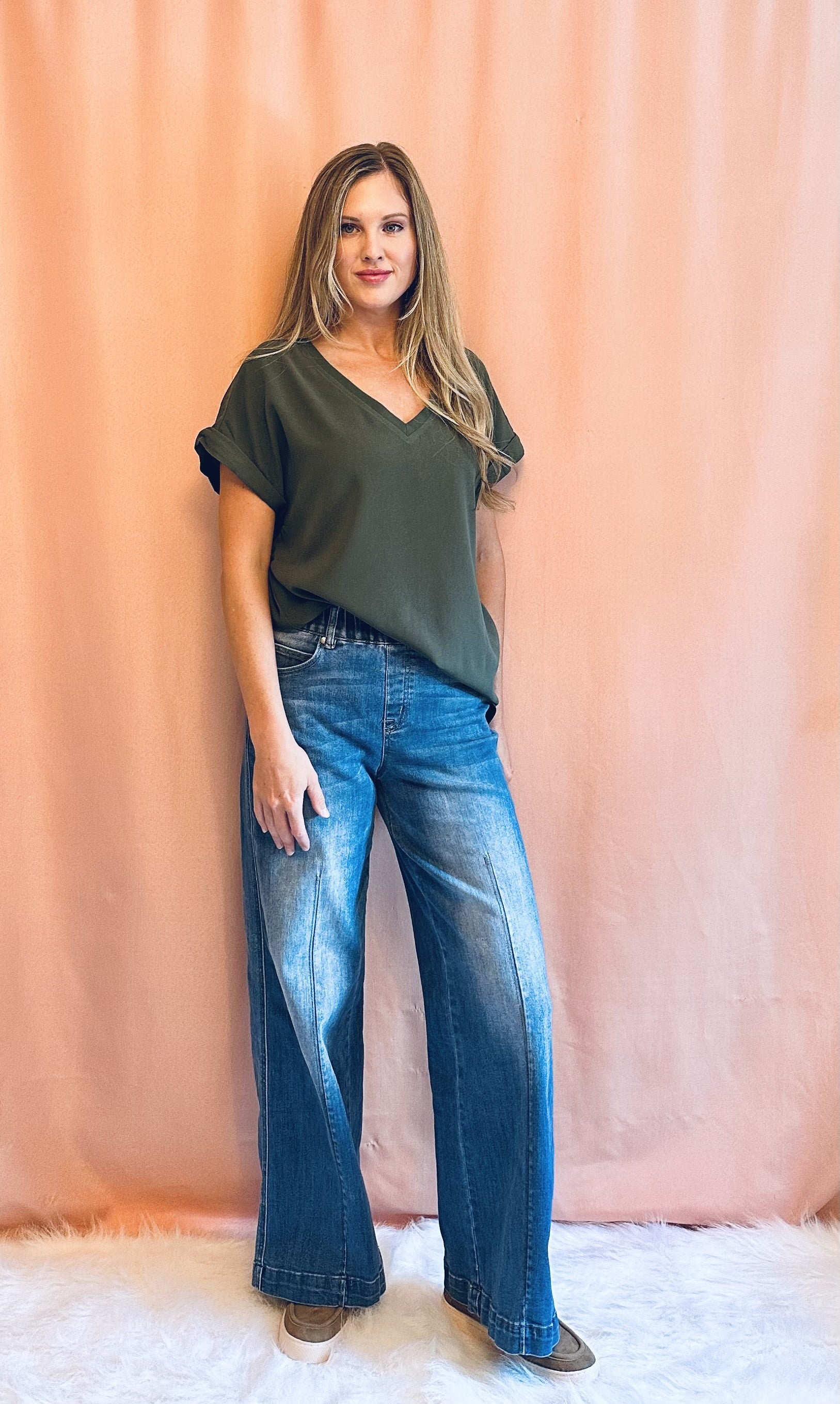 This Basic V-Neck Top features a flattering v-neck design and cuffed sleeves for a stylish and versatile look. Made of high-quality material, it offers both comfort and durability. A must-have addition to any wardrobe.